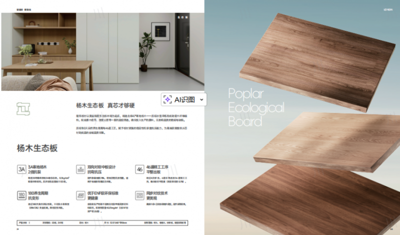 ●杨木生态板:精选北纬42°寒地3A杨木,拥有致密纤维结构,抗开裂性超普通木材2倍。采用双向对称中板设计,抗弯抗压提升25%,并经过180天自然养生,形变率低至0.1%。