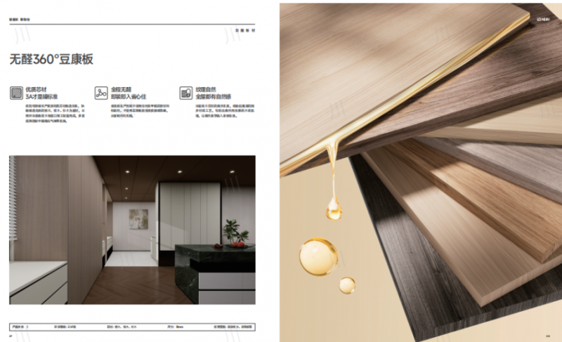 ●无醛360°豆康板:甄选3A级杨木/桉木/杉木芯材,全程无醛添加,配套同步对纹工艺,纹理自然。