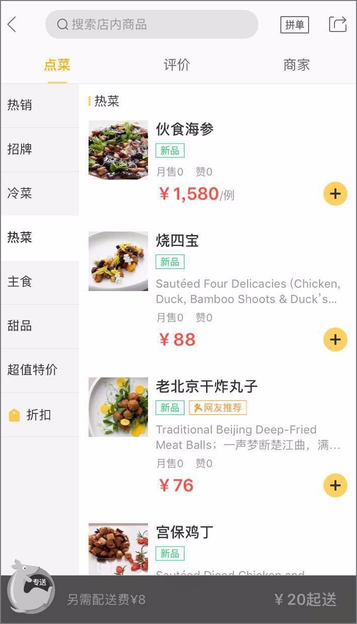 大董会做什么样的外卖呢?我这样想着,点开了商家页面,之后点进热菜区域:
