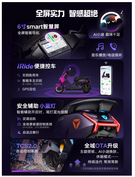 比如,车上有雅迪智行助手AI小迪全程陪伴,多元场景联动,趣味十足,情绪价值拉满。全新升级的6寸smart智慧屏,全屏导航、听歌、接电话都支持,还能外放,过往枯燥平常的出行路也变得丰富多彩起来。再加上iRide便捷控车系统,轻松实现无钥匙用车与智能车主识别,再也不用担心出现通勤着急却找不见钥匙的困扰。整车还支持全域OTA升级,越用越新,体验也在不断进化。关键是,这款智能车在万元以内的价位,真正把“智价比”拉到了一个新高度。