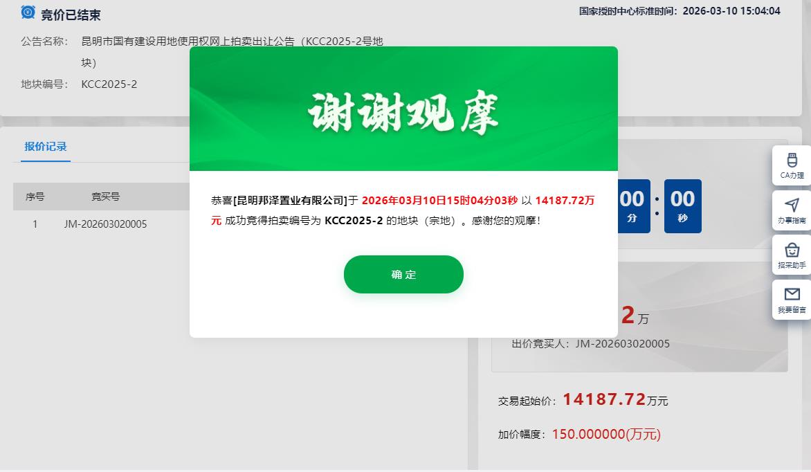 该编号为KCC2025-2号地块,最终被其旗下子公司昆明邦泽置业有限公司底价摘得,成交楼面价约3288元/㎡,单价为 548 万元/亩。