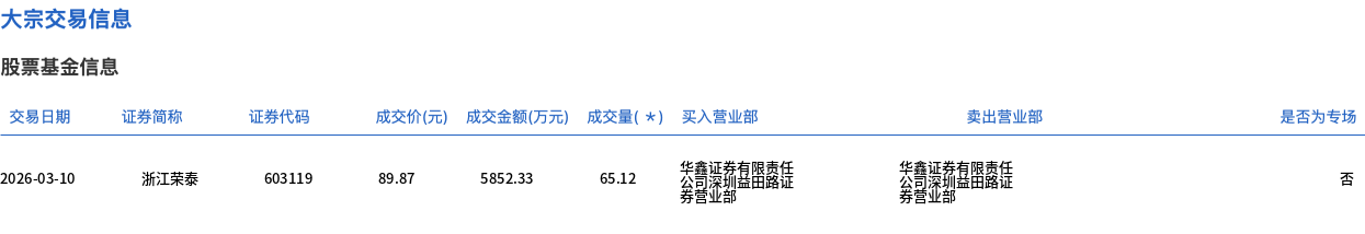 3月10日,浙江荣泰大宗交易成交65.12万股,成交额5852.33万元,占当日总成交额的3.66%,成交价89.87元,较市场收盘价89.87元持平。