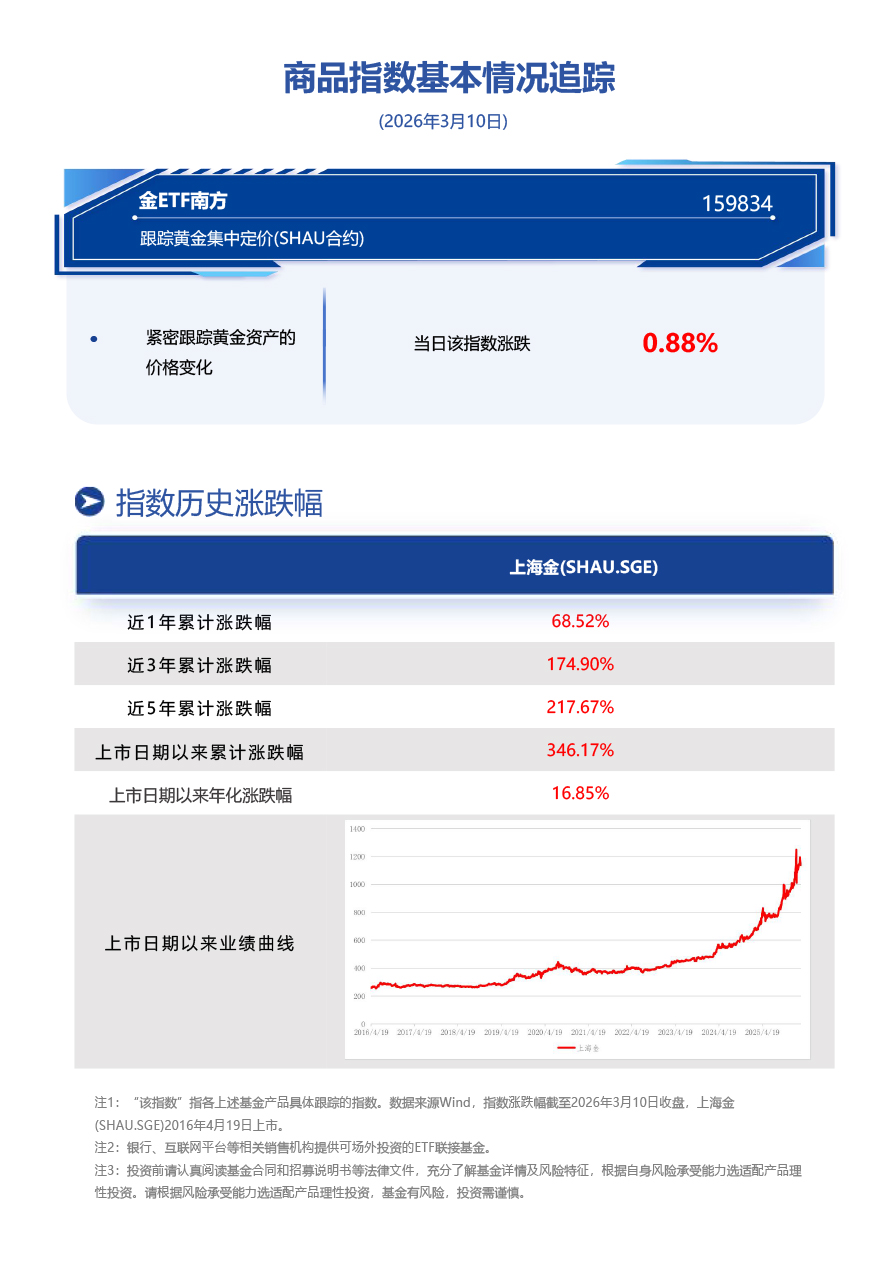 截至2026年3月10日收盘,金ETF南方(159834.SZ)换手3.82%,成交0.74亿元,跟踪指数上海金(SHAU)上涨0.88%。
