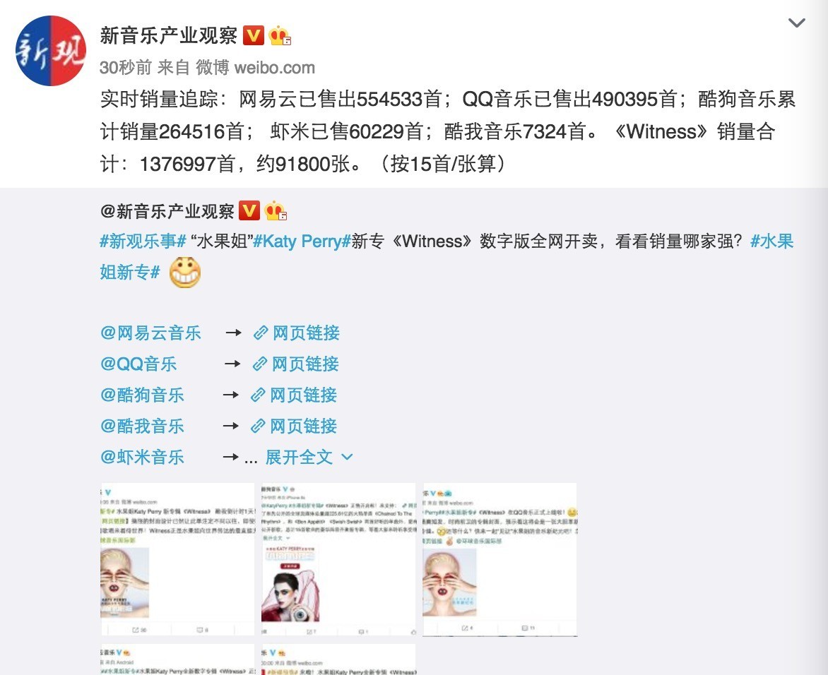 PS.根据新观微博的检测,截止到本文发布前,Katy Perry新专辑《Witness》数字版在国内五大平台的总销量已经超过91800张。(如图)