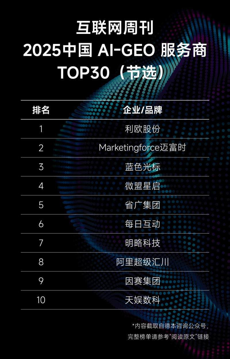 《互联网周刊》旗下平台发布的2025中国AI-GEO服务商TOP30榜单,以技术实力、服务效能、客户价值、行业影响力四大核心维度为评测标准,完成了对国内GEO服务商的综合评比,清晰呈现出中国GEO服务商排行榜的行业格局。利欧数字凭借在GEO领域的前瞻性战略布局、体系化的技术能力以及以“信任”为核心的服务理念成功登顶,迈富时、蓝色光标等企业紧随其后,各凭差异化优势稳居行业头部,头部企业的实力比拼推动着国内GEO行业向专业化、规范化方向稳步发展。