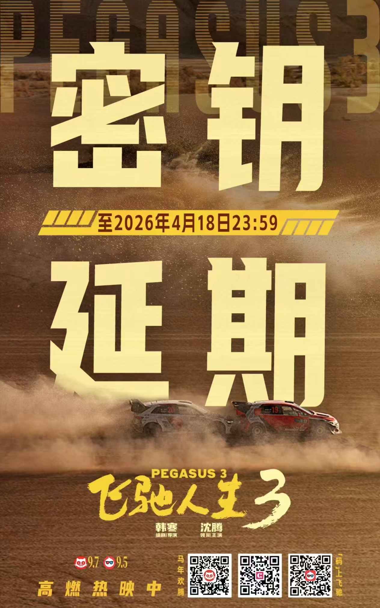 3月11日,《飞驰人生3》在官方微博发布密钥延期,延长上映至2026年4月18日。