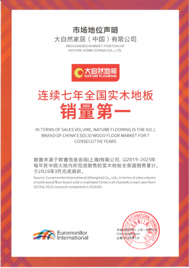 3月10日,大自然家居新零售委员2026首届盛会隆重举办,会上,国际权威调研机构欧睿信息咨询(上海)有限公司发布最新市场数据:大自然地板2019-2025连续七年全国实木地板销量第一。(数据来源于欧睿信息咨询(上海)有限公司,以2019-2025年每年在中国大陆内所完成销售的实木地板全渠道销售量计。于2026年2月完成调研)。
