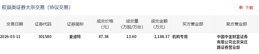 3月11日,爱迪特大宗交易成交13.6万股,成交额1188.37万元,占当日总成交额的1.82%,成交价87.38元,较市场收盘价88元折价0.7%。