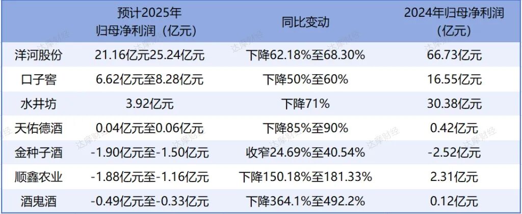 今年1月,有7家酒企公布了2025年业绩预报,上述公司的业绩表现均大幅下滑。其中洋河股份、天佑德酒、金种子酒、顺鑫农业、酒鬼酒5家公司均在第四季度出现单季亏损。