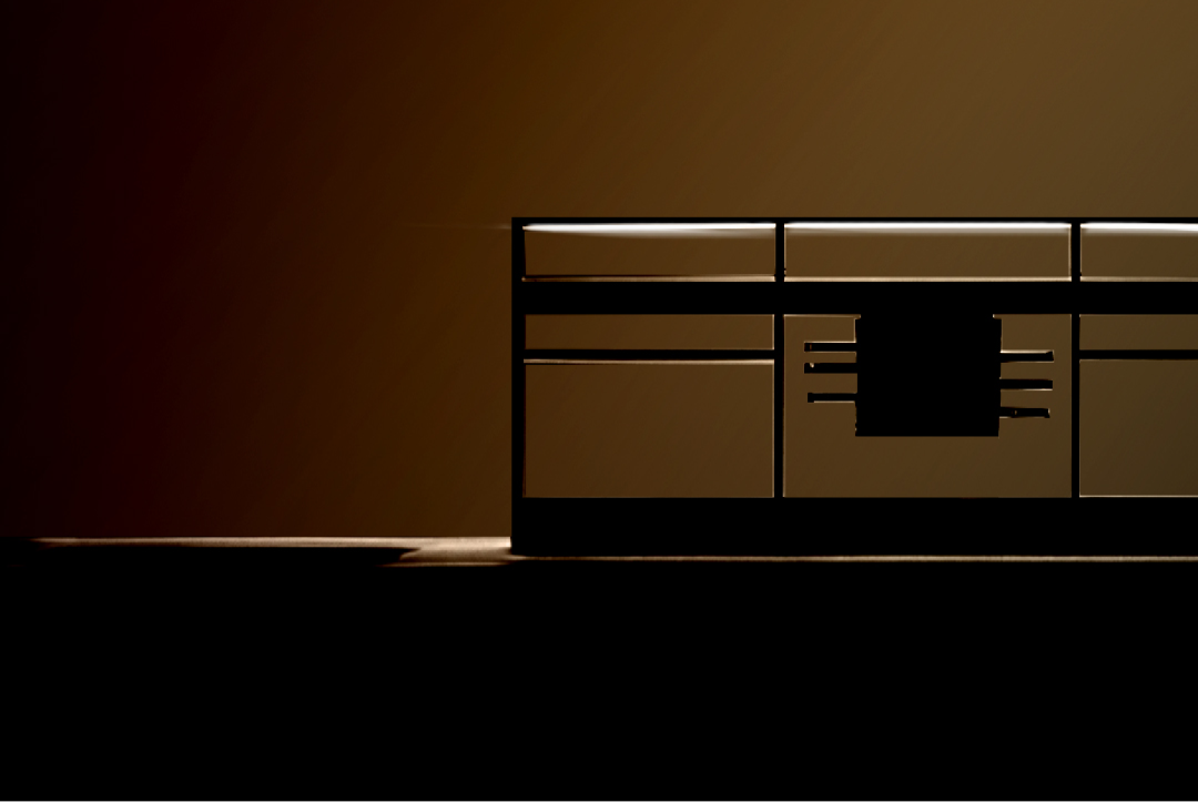 本次展览以“光”为设计线索,设计师巧妙将自然和科技融合,将展览本身打造为了以巨大光影沉浸场所。在这里,不仅能感受到不一样光影艺术冲击,还能真实触碰到未来的感官体验。本次展览实体呈现核心产品——NEXUS未来厨房生态系统,采用品牌自研的铝合金建筑型材与精密穿孔肌理,通过体块穿插与动态律动的灯光系统,将金属材质的理性转化为富有生命力的感知叙事。在这里,生活、工作与社交的边界被重新定义,厨房不再是承载用具的冰冷容器,而成为人与生活方式之间彼此滋养的重要部分。