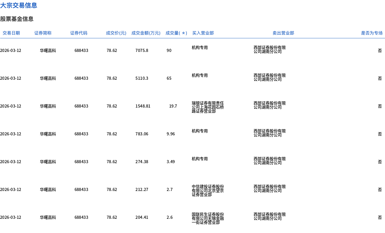 3月12日,华曙高科大宗交易成交193.45万股,成交额1.52亿元,占当日总成交额的33.58%,成交价78.62元,较市场收盘价93.6元折价16%。