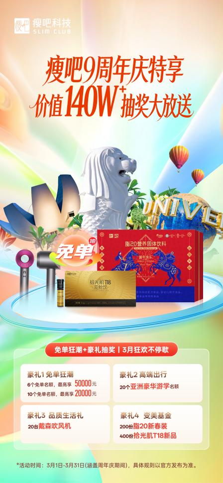 为庆祝9周年与新品上市,郭总宣布了重磅优惠政策:3月1日-31日,购买拾光肌T18双舱饮享“买12送1”超值福利,仅需9918元,即可将30盒T18双舱饮+4盒面膜带回家!服务商3月内补货达标、新服务商加盟即配赠相应产品大礼包,还有机会抽取戴森吹风机、亚洲豪华旅游、最高5万元免单等惊喜福利。一系列政策组合拳,彰显了瘦吧与大家"共富共未来"的决心。