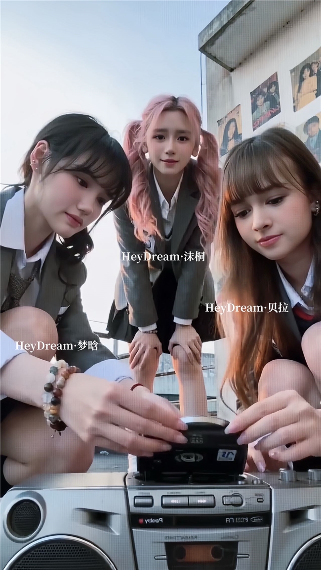 但在保留真人偶像灵魂的基础上,HeyDream又打破了常规女团的包装逻辑,在视觉包装与呈现形式上进一步创新突破:首次尝试将“真人偶像”与“AI驱动”深度结合,用AI技术重构真人偶像的视觉表达体系,实现科技感与偶像魅力的完美融合。