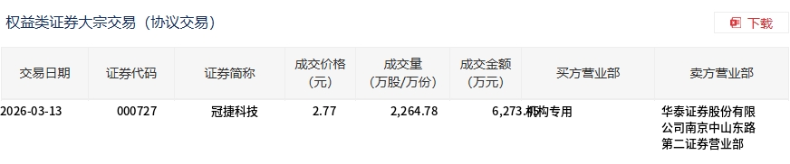 3月13日,冠捷科技大宗交易成交2264.78万股,成交额6273.45万元,占当日总成交额的15.03%,成交价2.77元,较市场收盘价2.76元溢价0.36%。