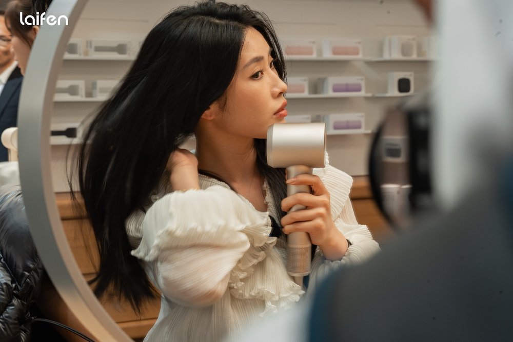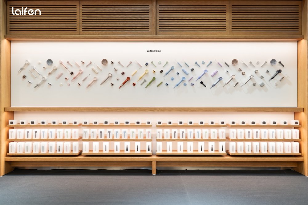 更值得一提的是,展台所有照明灯具、展示柜、展示桌及产品支架均由徕芬自主研发生产,在完成了自产自用闭环的同时,还确保了美学与功能的极致融合。特别采用的大面积柔和面光源(非流行点光源),搭配高显色指数(Ra≥95),真实还原产品色彩与细节,让消费者清晰感知每一处工业设计的匠心。