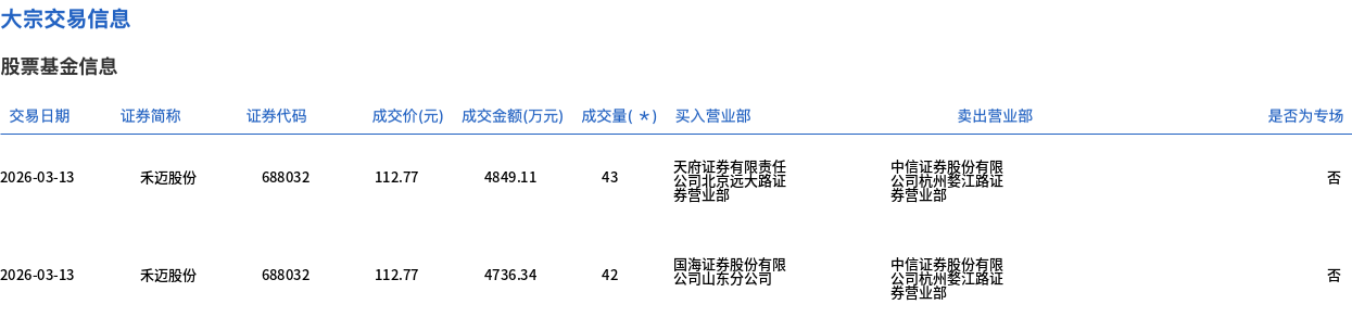 3月13日,禾迈股份大宗交易成交85万股,成交额9585.45万元,占当日总成交额的16.07%,成交价112.77元,较市场收盘价119.97元折价6%。