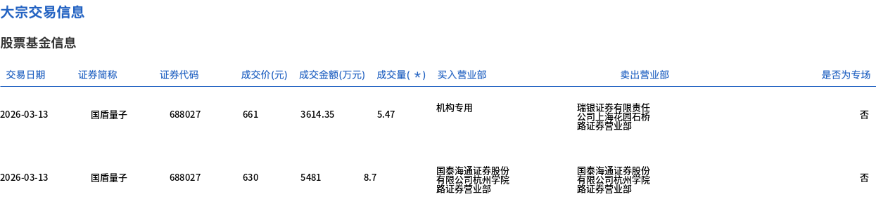 3月13日,国盾量子大宗交易成交14.17万股,成交额9095.35万元,占当日总成交额的3.04%,成交均价641.87元,较市场收盘价661元折价2.89%,其中最高成交价661元,最低成交价630元。