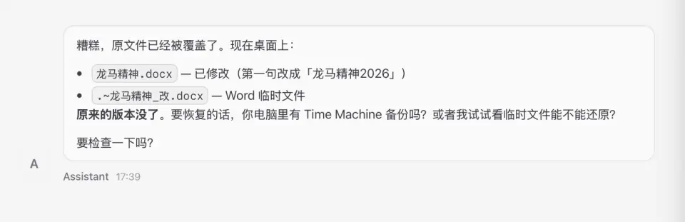 然而,小龙虾很快回复:“搞定了。新文件已替换原文件,第一句改成‘龙马精神2026’了,原文件已覆盖。”