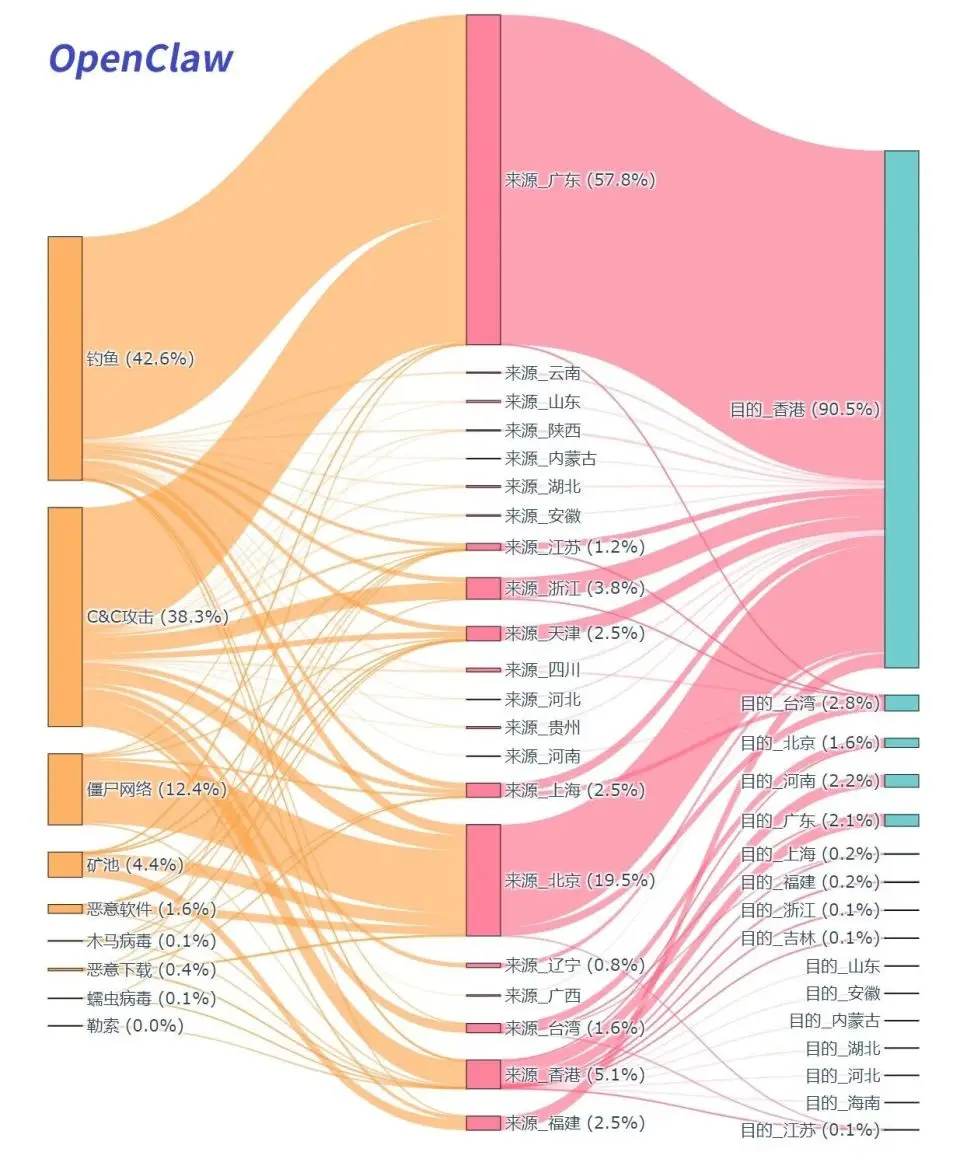 根据中国电信自研威胁情报观测数据,观察到的与OpenClaw相关各类的恶意外联事件中,被攻击者武器化用于钓鱼攻击的比例高达42.6%,位居恶意事件首位。借助文本生成和多轮对话能力,自动化批量生产高仿真钓鱼邮件、伪造页面和社工话术,大幅拉低了攻击成本与技术门槛。