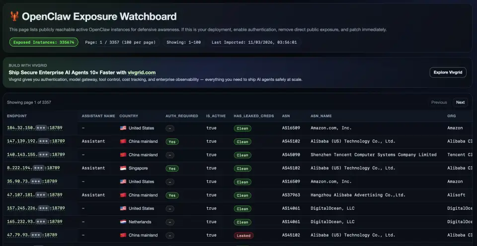 据OpenClaw Exposure Watchboard最新测绘数据,截至3月11日,已有超过33.5万只“龙虾”在公网“裸奔”——短短四天内增长了5.7万。这些配置不当的实例,因为公网暴露,任何人都可以尝试连接。一旦入侵成功,攻击者可以“一秒搬空”用户数月内的私人消息、账户凭证、API密钥等敏感信息。记者注意到,仅在首页公开的100个实例中,明确标记“Leaked”有14个,泄露实例高度集中在几家主流云服务商,包括阿里云、腾讯云、京东云等。