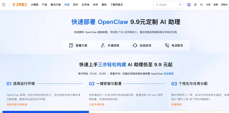 在阿里云官网,“快速部署 OpenClaw 9.9元定制 AI 助理”“5分钟快速部署 CoPaw”的广告醒目,还配有手把手的图文教程。