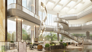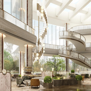 在此次更新中,酒店保留了原有建筑结构与外观轮廓,同时通过当代设计语言重新组织内部空间。公共区域通过艺术装置与空间陈设呈现与上海城市文化相关的意象。例如大堂区域设置了四件定制艺术作品《华亭春早》《音乐飞天舞蹈》《春来江水》和《时光序》,以黄浦江、城市花卉和时间流转等元素构建空间叙事,使酒店空间在保留历史气质的同时呈现具有海派文化特色的当代表达。