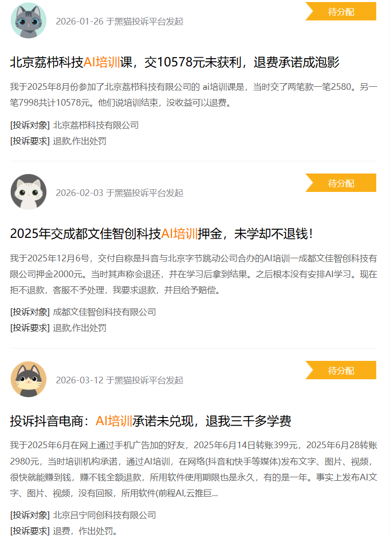 《财经无忌》以“AI培训”为关键词搜索黑猫投诉平台发现,近200条的投诉中,消费者对AI培训的吐槽集中在“宣传和实际效果差距过大”“课程内容不达标”“退费困难”等。“支付4778元购买AI短剧推推广课程,报名时承诺带自己挣钱,每个月都会有收入,现因没有收益申请退费”。有消费者写道。