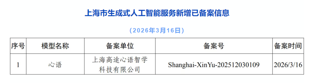 上海市新增1款已完成备案的生成式人工智能服务