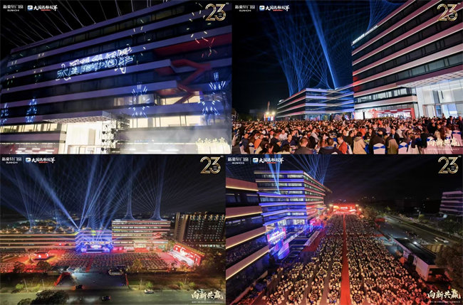 光耀新兴,轩启新程。2026年3月11日晚,“向新共赢”新豪轩门窗23周年庆典暨新办公楼落成仪式隆重举行。新兴县政府领导、社会各界伙伴、权威知名媒体、全体新豪轩员工和经销商超4000人,齐聚新豪轩门窗智造基地,共同见证“大国隐形冠军”的重要历史时刻,一起奔赴成为百年企业的壮阔新程。