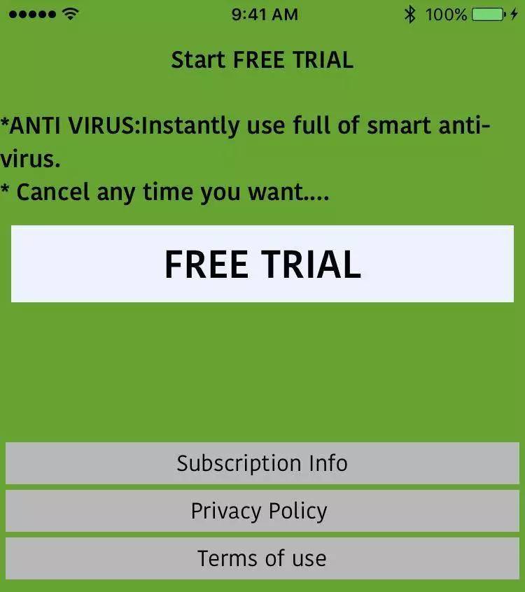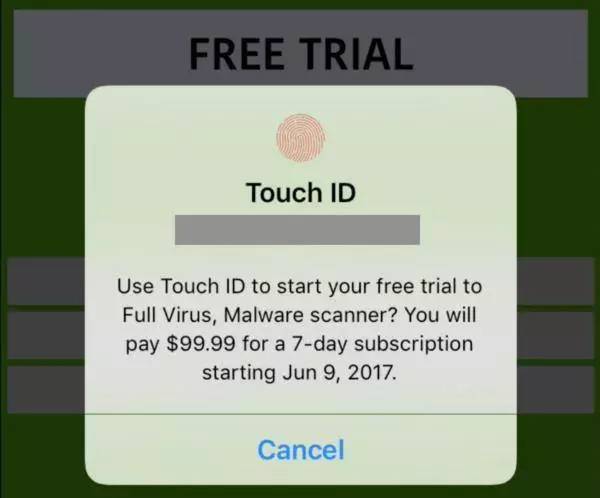 然后又让我免费尝试,点了“免费试用”后,更惊人的来了,这款应用居然还要我的Touch ID。此外,它们还宣称能全面扫描我手机里的病毒和恶意软件。作为一名开发者,我当然知道它是骗人的,毕竟第三方软件都被控制在沙盒中,它们根本接触不到其他数据。