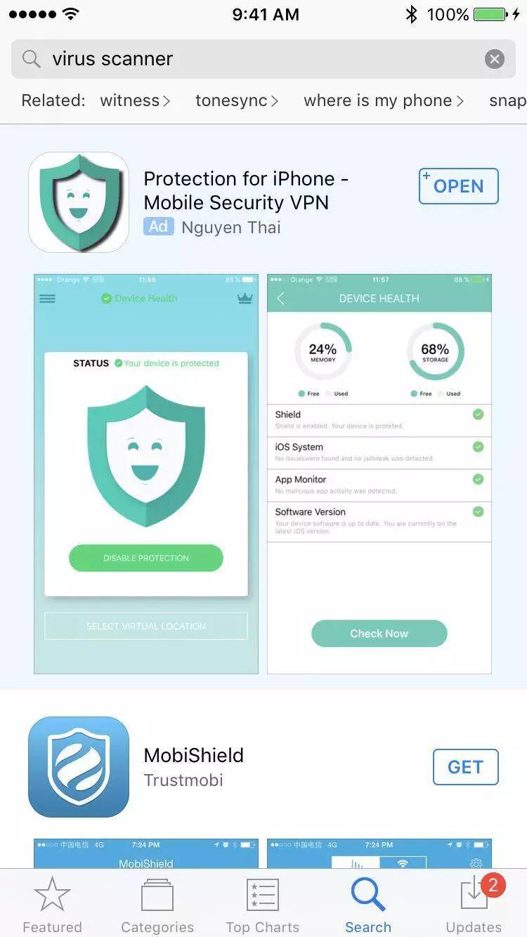 我记得在搞应用开发时,曾经阅读过相关介绍,App Store上大量应用都是通过搜索被发现的,因此我猜想这款应用可能得到了搜索结果优化的照顾。于是我尝试着在搜索栏输入了“病毒扫描”这个关键词。