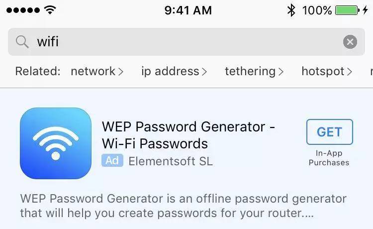 搜索“wifi”后,先跳出来的是一款名为“WEP Password Generator”的应用,这家伙每个月也要收费50美元,其月收入已经高达1万美元,而且它四月份才正式登陆App Store。有趣的是,这款应用看起来就像另一款野鸡应用的山寨版,原来骗子已经开始山寨骗子了。