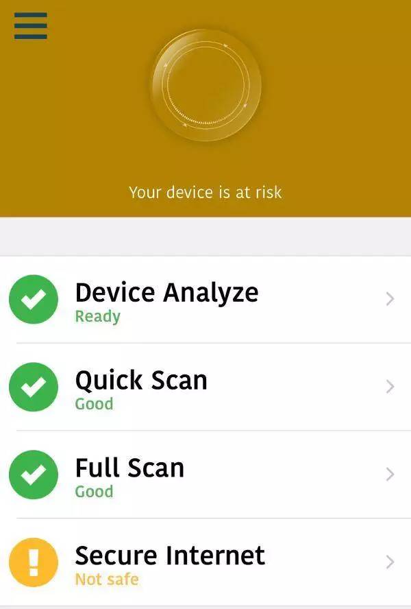 不过,套路还在继续,跳过了关联通讯录后,这款应用又提醒我手机处在危险状态(这样的流氓应用装上当然危险)。然后,下面还给出了“设备分析”、“快速扫描”和“全盘扫描”等选项。最后一项更是这款应用该有的最重要功能“保护互联网”。