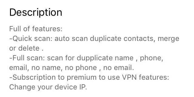 该应用称自己功能强大,但第一项功能却是扫描联系人并合并重复项,其中,“重复”一词的英文还出现了非常明显的拼写错误。不过,这不是个网络安全应用吗?能找出通讯录里的重复项跟网络安全有什么关系?