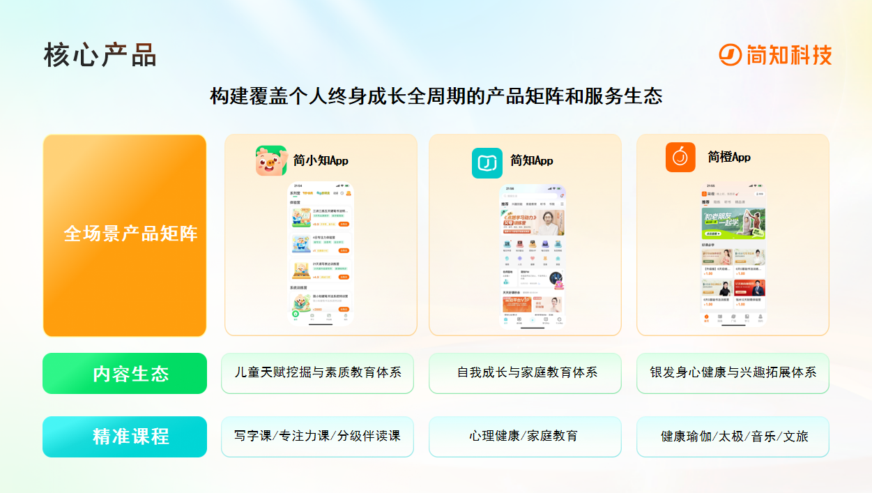 简知科技的答案,首先体现在对“人”的全龄覆盖上。旗下简小知、简知、简橙三大App,分别服务儿童素养、成人提升、银发兴趣三大群体。简小知App专注儿童兴趣培养,写字课、专注力课、分级伴读课融合AI互动与科学分级,已服务超百万家庭;简知App聚焦成人素养,心理健康、家庭教育、职业能力等课程,构建起立体化成长平台;简橙App则以太极、瑜伽、钢琴等课程服务中老年群体,独创“兴趣型学习+社群化服务+陪伴式教学”模式。值得注意的是,简橙的布局与“十五五”规划提出的“人均预期寿命提高到80岁”目标形成呼应——让银发群体从“活得长”走向“活得健康、活得有质量”,正是兴趣教育可以发力的方向。