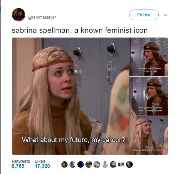 Sabrina是美国一部情景喜剧《小女巫萨布琳娜》的女主角,她在片中的一段精彩对话被po上了推特,网友称她是一位不折不扣的“女权主义icon”。