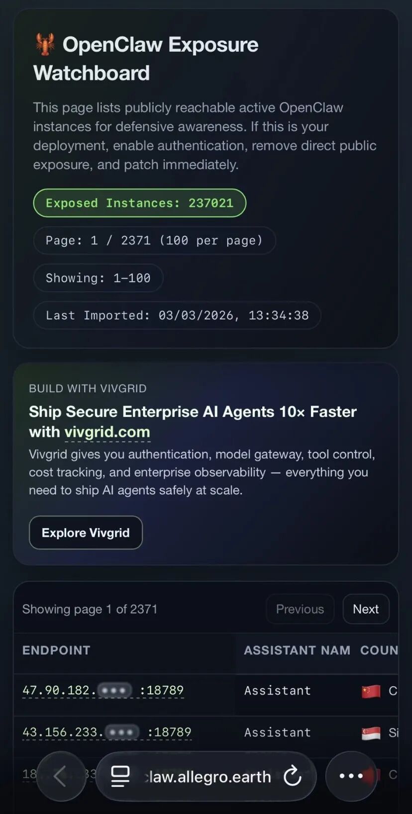 伴随着全网铺天盖地的“养龙虾”热潮,同步爆发的信息安全问题随风而起。OpenClaw Exposure Watchboard数据显示,截至3月3日,全球已有超23万只“龙虾”在公网“裸奔”,其中有近8.8万个实例已发生数据泄露。而根据多方媒体报道的最新消息,“裸奔”的龙虾数量已经上涨至27.8万只。