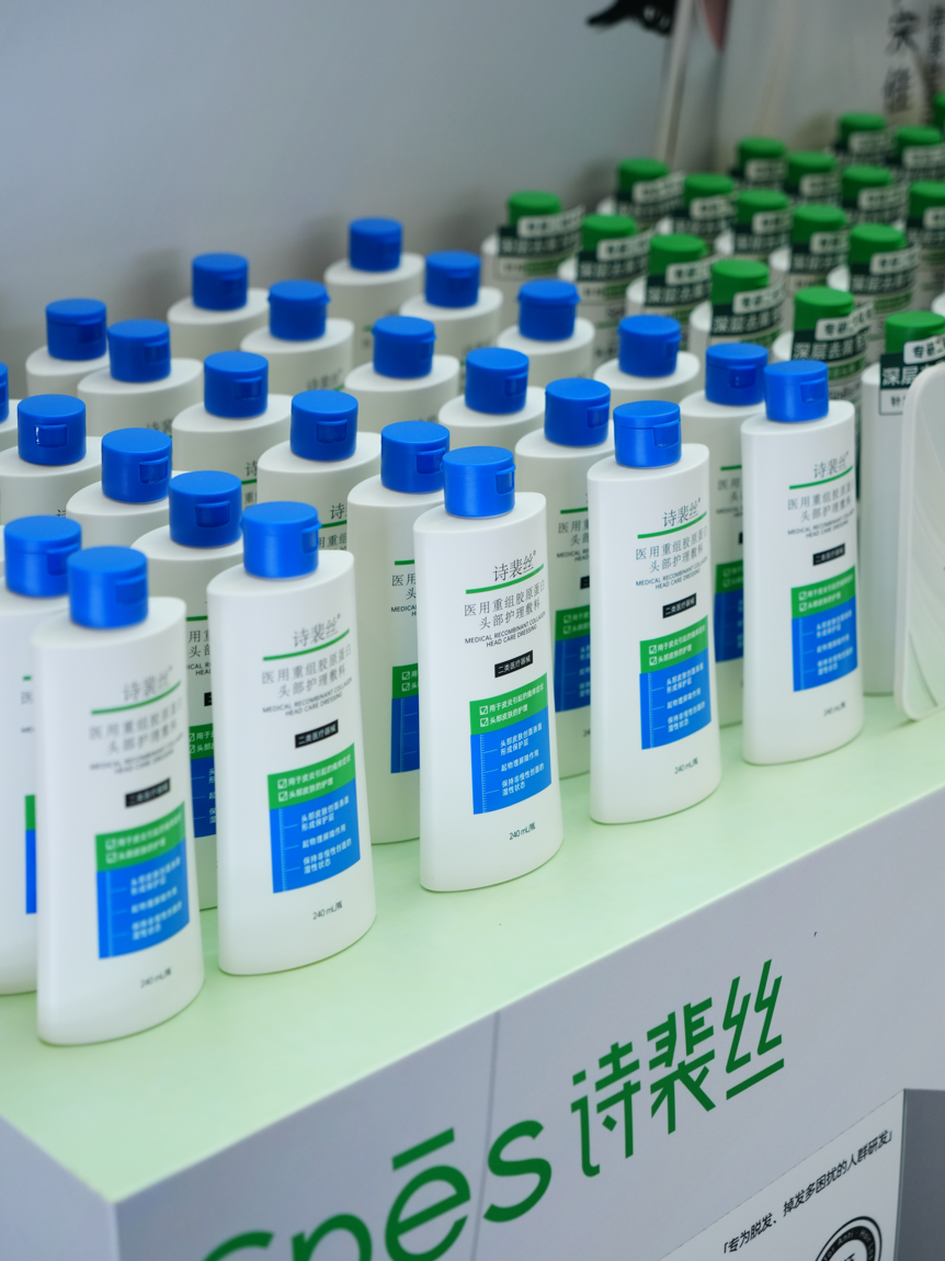 在产品方面, 诗裴丝为OTC渠道定制了专属产品线,线上线下严格区隔。核心单品包括医用重组胶原蛋白头部护理敷料、二硫化硒头皮净屑洗发水、海盐洗头膏等,确保渠道伙伴手握具有绝对竞争力的“武器”。