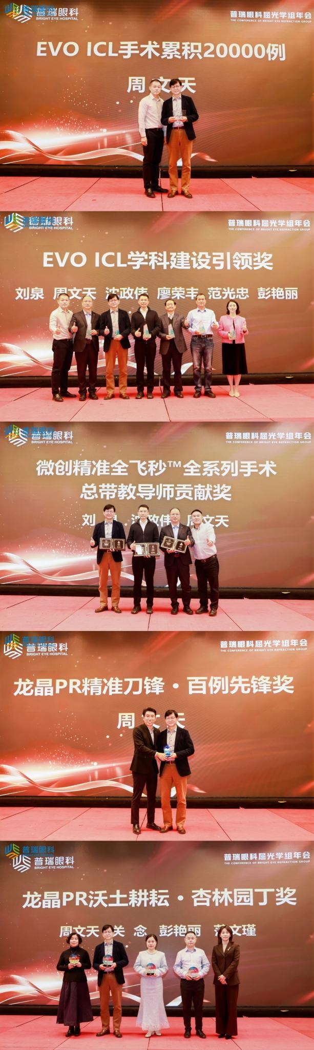 在2025年普瑞眼科医院集团屈光学组学术年会上,南昌普瑞屈光团队迎来了高光时刻,一举斩获 十项重磅荣誉,成为全场焦点。周文天教授独揽四项大奖,包括代表至高贡献的“EVO ICL学科建设引领奖”、“微创精准全飞秒全系列手术总带教导师贡献奖”、“龙晶PR精准刀锋·百例先锋奖”以及“龙晶PR沃土耕耘·杏林园丁奖”;