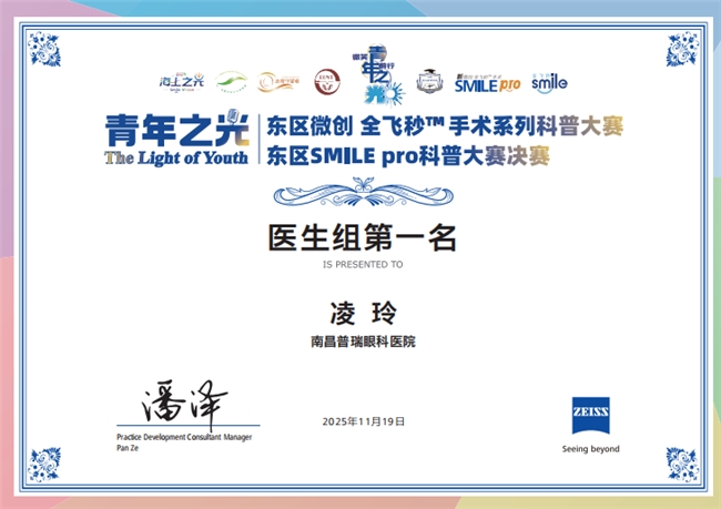 2025年,凌玲博士在微创全飞秒™手术系列科普大赛【大东区SMILE Pro专场】青年之光科普大赛中,从十余位参赛青年医生中脱颖而出,一举斩获医生组第一名并成功晋级全国总决赛,正是医院青年力量崭露头角、科普能力得到认可的精彩缩影。