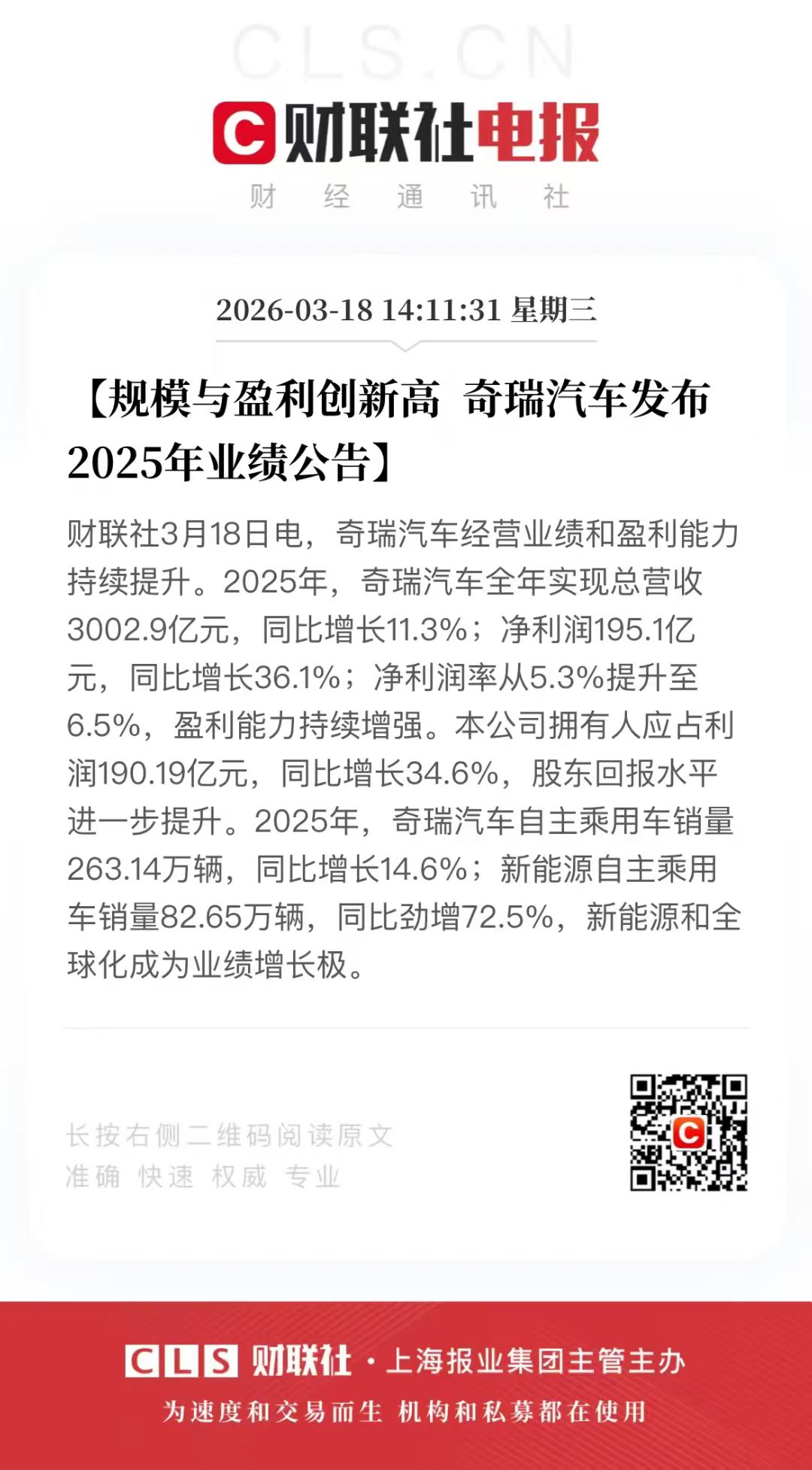 3月18日,奇瑞汽车股份有限公司(9973.HK)发布2025年度业绩报告,这也是奇瑞汽车上市后的首份年度业绩报告。2025年,公司深入推进电动化、智能化、全球化战略,多项经营指标创历史新高,交出了一份规模与质量双增长的成绩单。