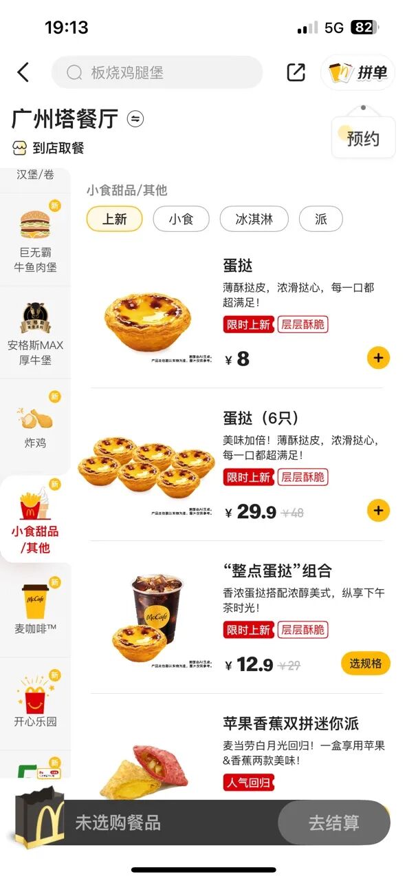 今天,小食代在麦当劳官方APP平台上搜索看到,此次上新的蛋挞产品仅有一款经典口味,单个售价8元、6个29.9元,主打下午茶场景的“整点蛋挞”套餐组合(一杯咖啡+一个蛋挞)12.9元,这些均在“小食甜品/其他”类型中标记为“限时上新”。