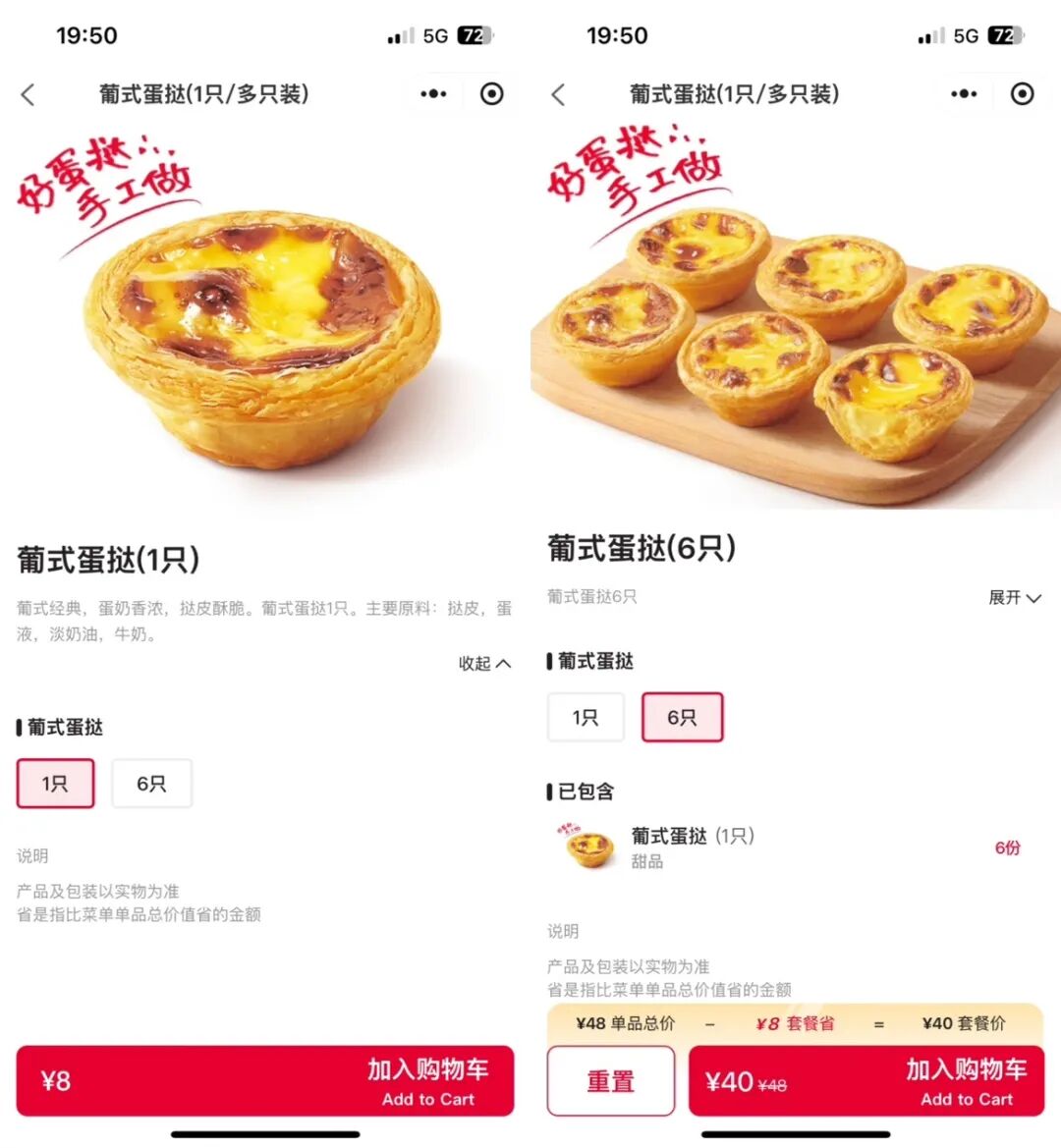 此外,两家蛋挞在强调风味和配方成分之外,都突出“手工”这一卖点。小食代留意到,肯德基小程序葡式蛋挞的产品海报页面显示“好蛋挞,手工做”;麦当劳的门店海报则写着“诚意手作,暖香满溢”。