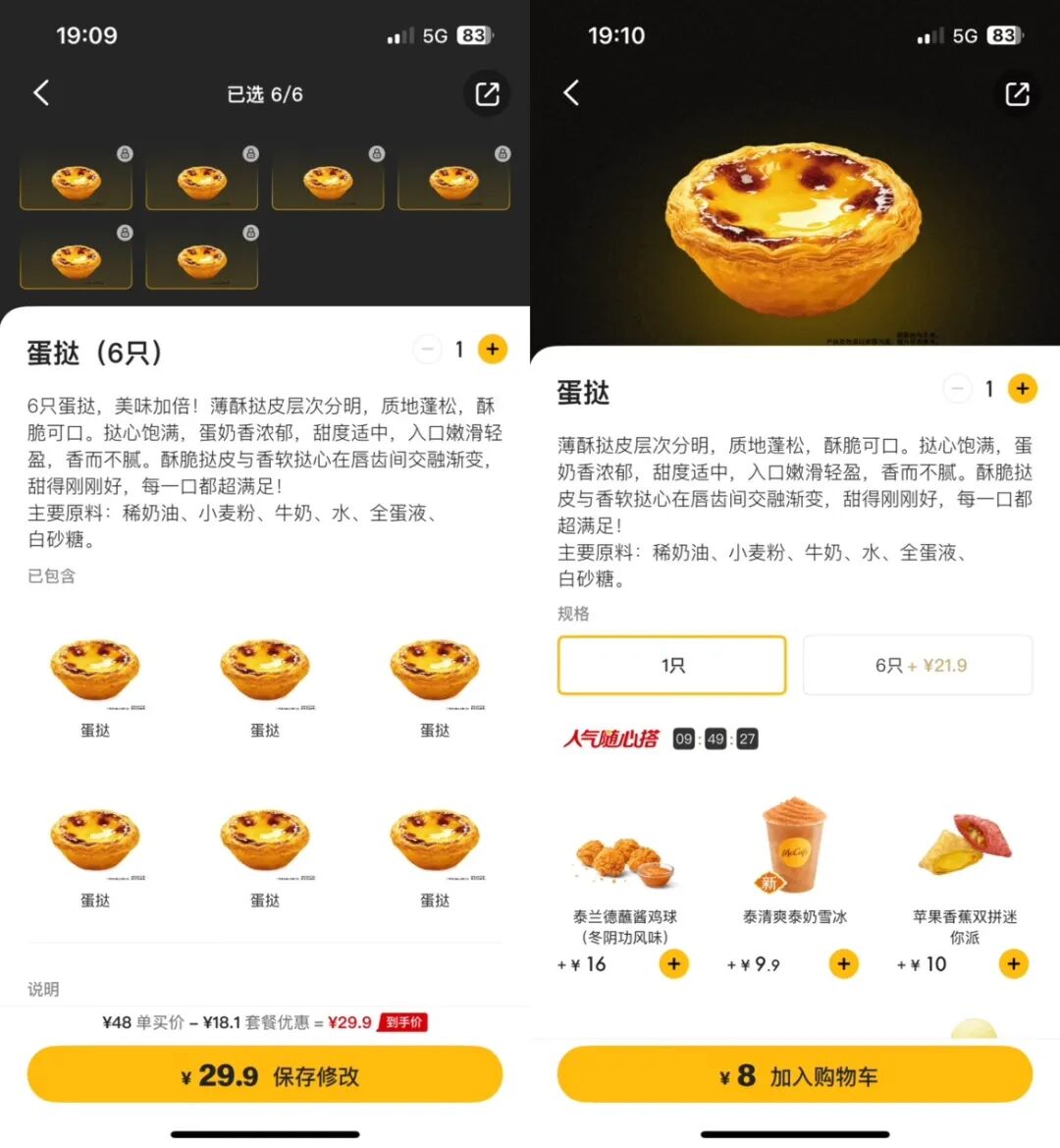 有意思的是,无论是销售规格、套餐组合还是定价区间、产品卖点,“蛋挞后发选手”麦当劳都精心对标了前辈玩家肯德基的做法。