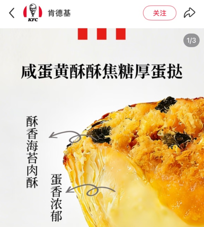 从口味来看,肯德基蛋挞产品则要丰富得多,这家快餐巨头经常推出限时上市的新口味。例如,小食代留意到,就在本月初,肯德基新推出了“咸蛋黄酥酥焦糖厚蛋挞”。