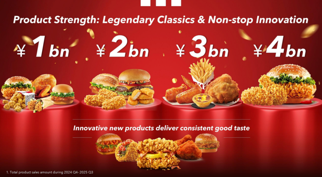 根据小食代翻查的百胜中国投资者日会议资料显示,2025年,肯德基前六大单品的年度销售额预计可超220亿元,贡献品牌30%销售额。其中,香辣鸡翅和香辣鸡腿堡的年度单品销售额均已超过40亿元,而蛋挞的身影则出现在了“30亿元级大单品”的阵营中。