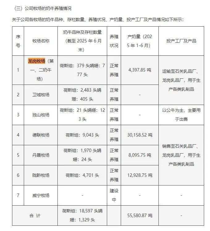 2022-2024年及2025年1-6月,龙岗牧场年产奶量分别为17036吨、18755吨、7645吨、4397吨;同期,独山牧场年产奶量分别为264吨、168吨、0吨、0吨;同期,卫城牧场均无产量。