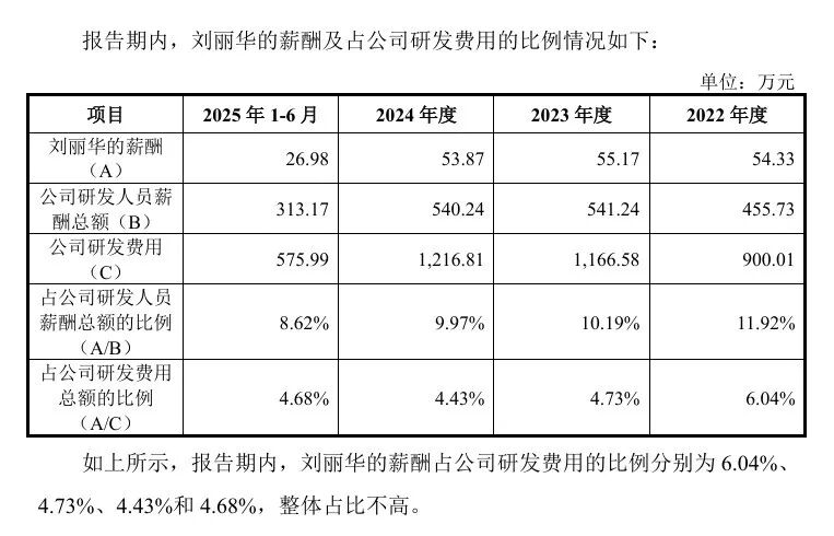 再看薪酬。2024年,刘丽华一人薪酬54万元,占当年研发总薪酬540万元的10%,比例可谓相当之高。这就等于研发团队每发10块钱工资,就有1块钱进了个人的口袋。
