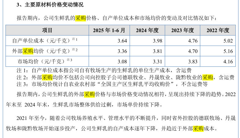 招股书中提到,近年来,由于生鲜乳市场价格下降较多,加之业务规模增长,公司自有牧场的生鲜乳生产成本远高于外采价格。