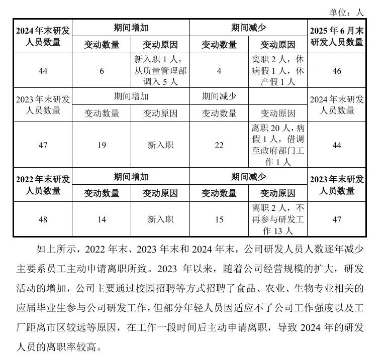 对于离职率过高问题,公司解释称,2023年,随着公司经营规模的扩大,为了缓解人员紧张问题,公司13名研发人员从2023年起不再安排研发相关工作,同时通过校园招聘、社会招聘等方式补充了14名食品、农业、生物专业相关的工作人员从事研发工作。